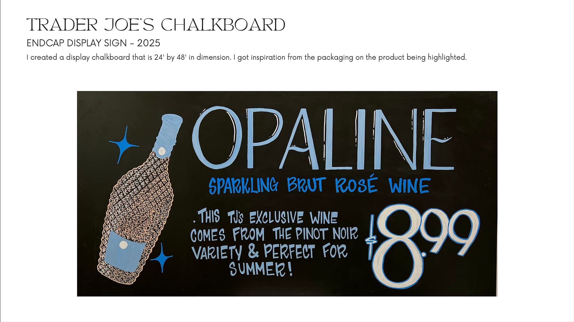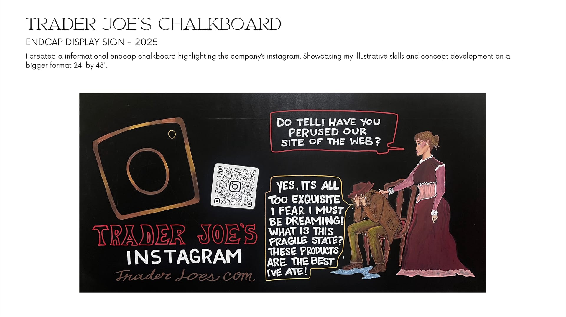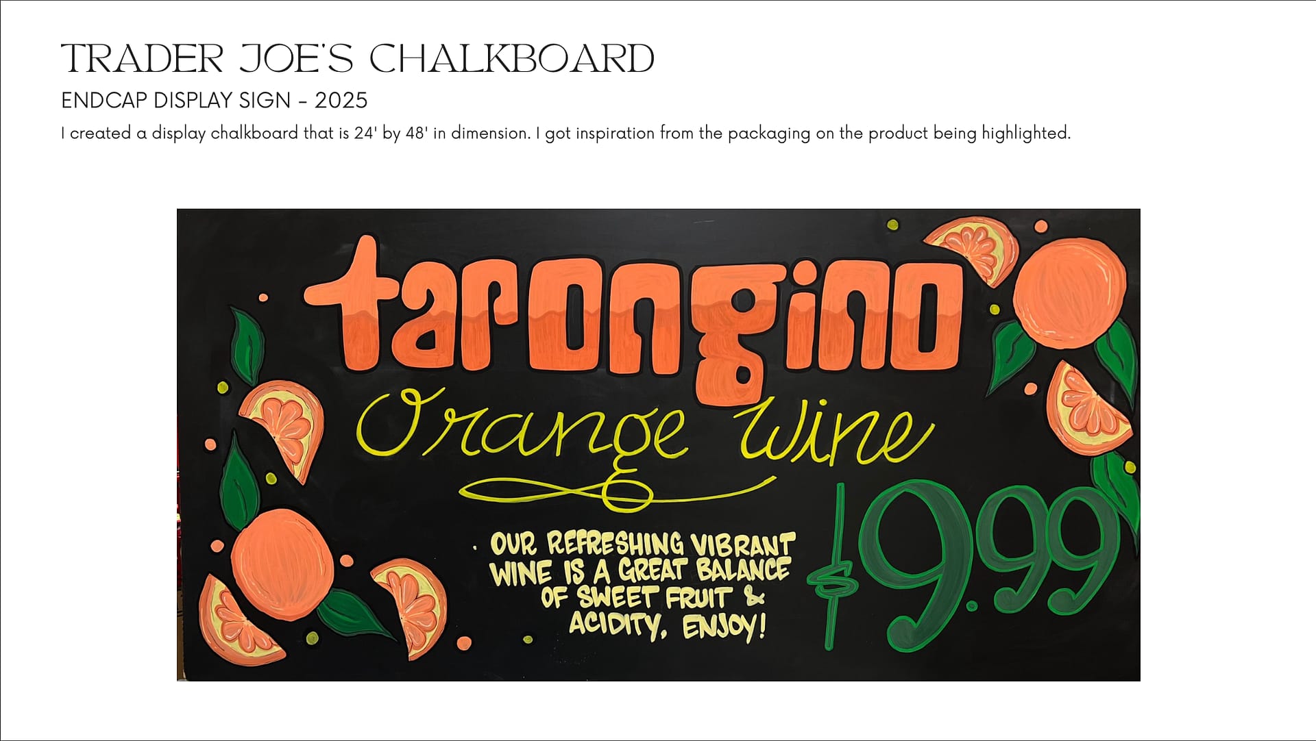 Official Portfolio Other Portfolios Trader Joe's ArtChalkboard displays, signage, and unique creative projects Personal ProjectsCommissioned works and Personal exploration Relevant StudiesCoursework demonstrating the skills honed during my academic career
